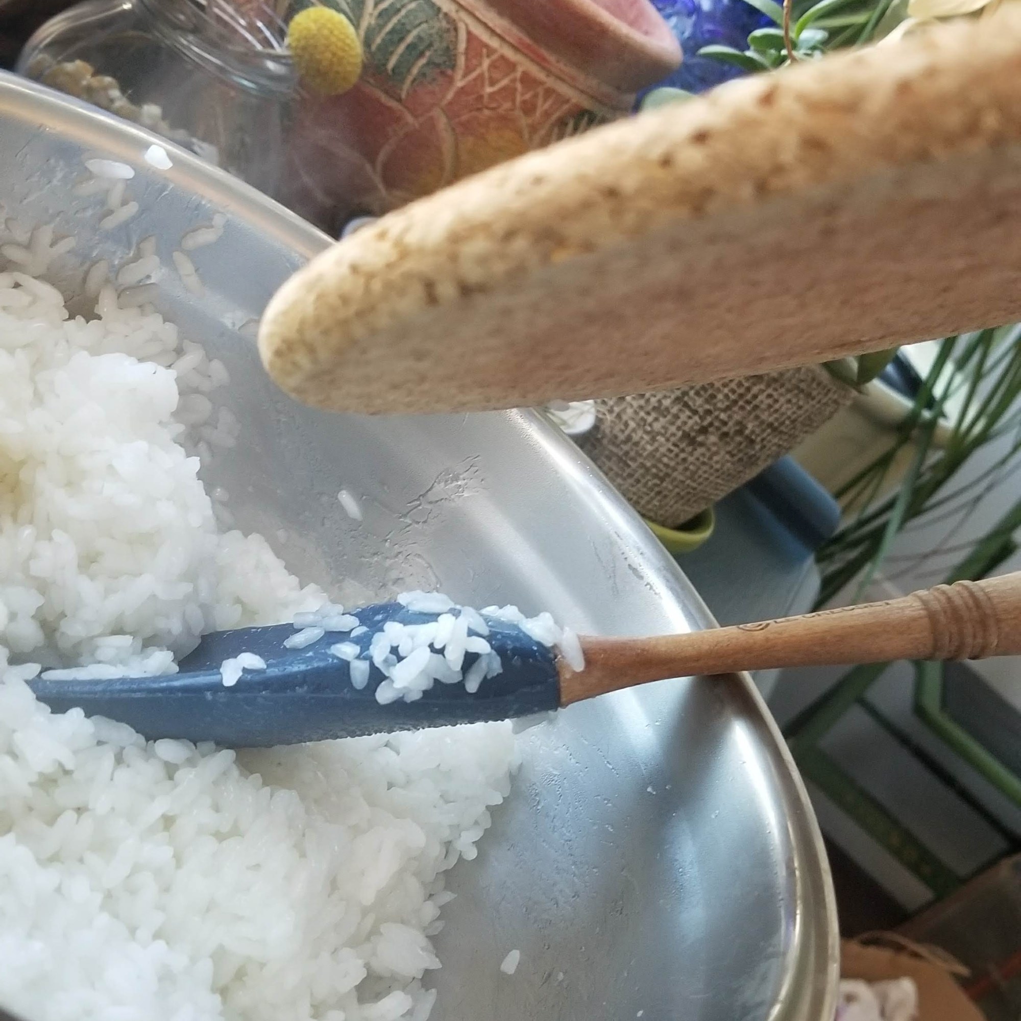 When the rice is cooked, stir in the seasoning. You must cool down the rice at this stage as well. Don’t stop stirring but BE GENTLE. You don’t want to mash it. Every few stirs, also fan the rice with something to help drive off steam and cool it down faster. When almost room temperature, cover with a wet towel and set aside.