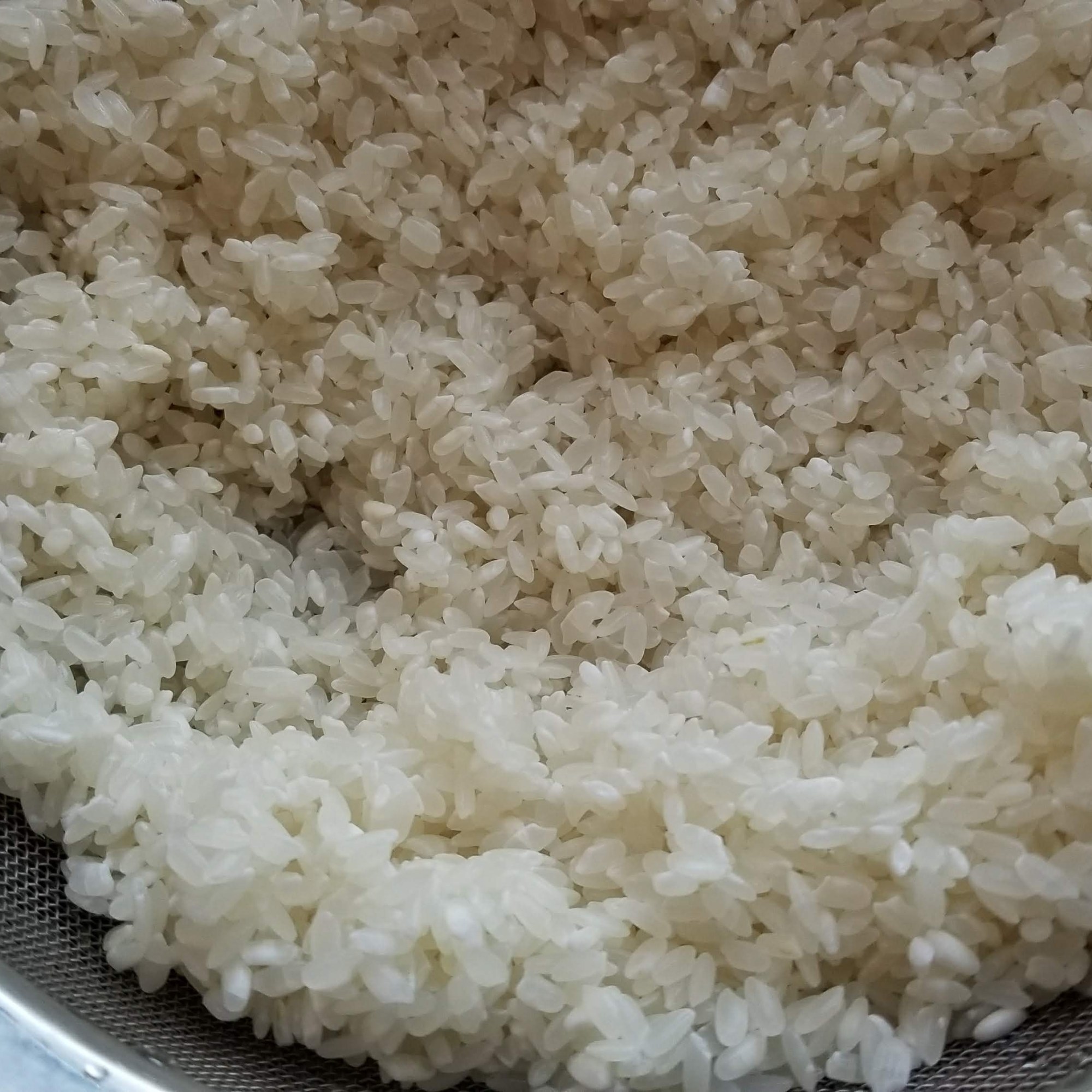 To start, you must wash the rice 4-5 times. Pour rice in a bowl and cover with ample cold water, stirring and rubbing the rice together with your hands. The water will turn opaque with starchiness. When this happens, quickly strain and then repeat. Keep washing and straining until the water stays clear with minimal starch.