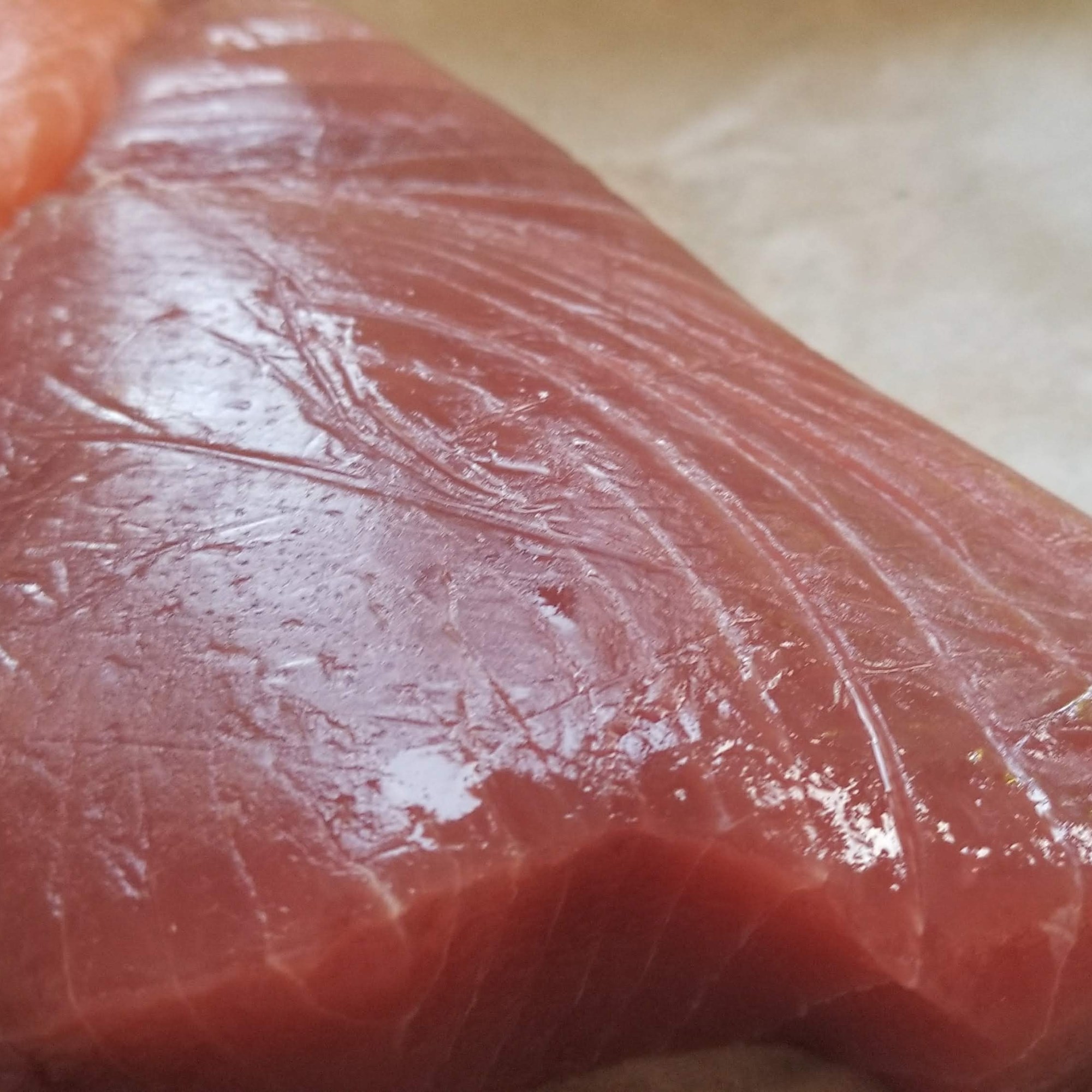 And also of course, I couldn’t make my first Sushi ever without a good wild caught salmon and yellow-fin tuna. Classic. Try to slice the fish in single strokes as opposed to sawing it. You’ll get cleaner, nicer pieces.