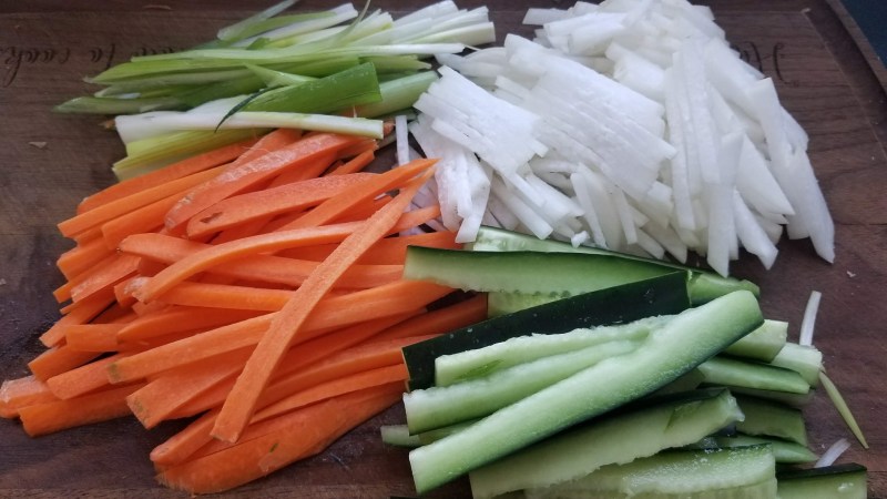 Prepare your Sushi filling. Aside from great fish, you might want some veggies. I went with scallions, cucumber, carrot, and of course Japanese daikon radish.
