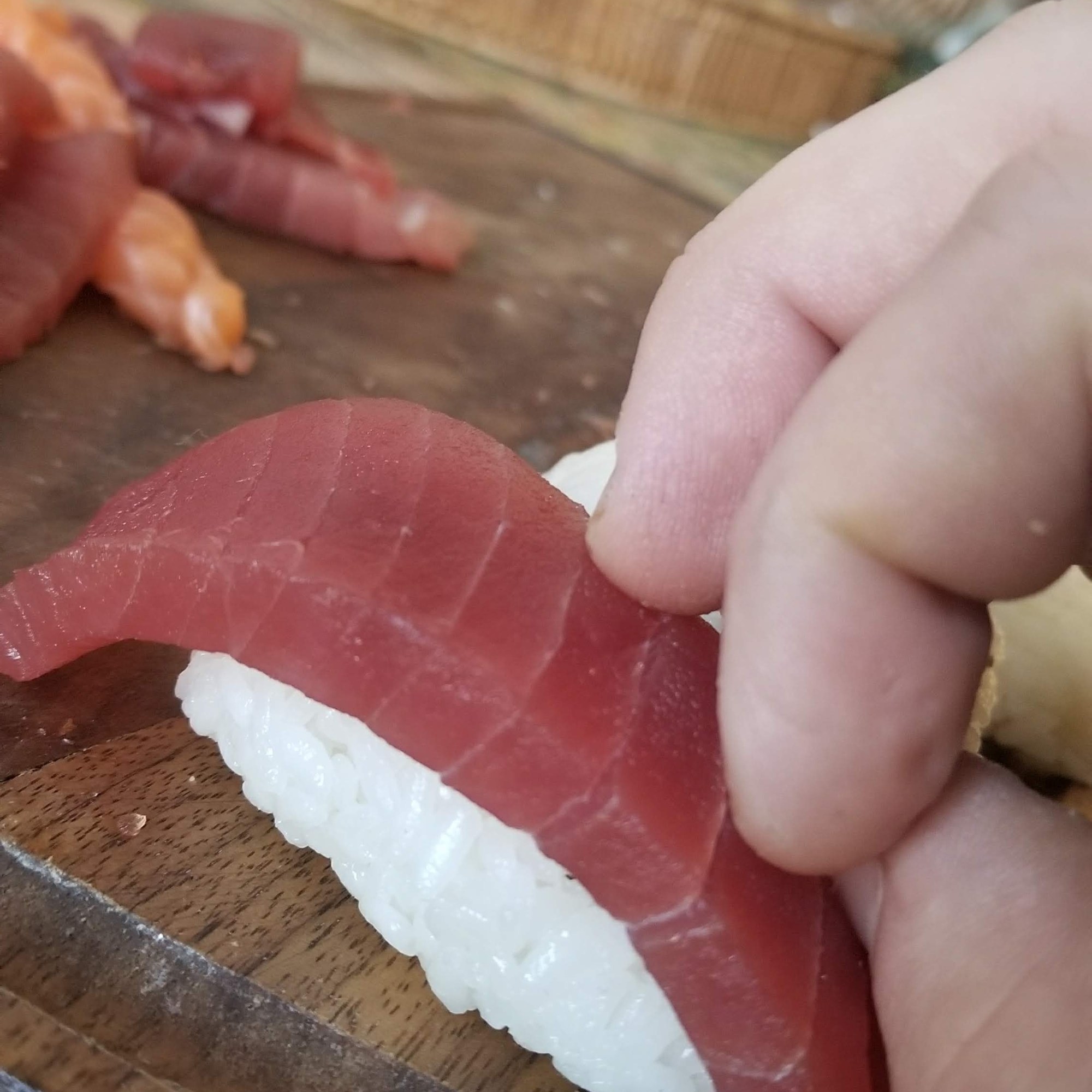 Simply use your wet hands to shape and roll the rice into little balls for Nigri. Drape your fish and use Nori scraps to tie one time around.