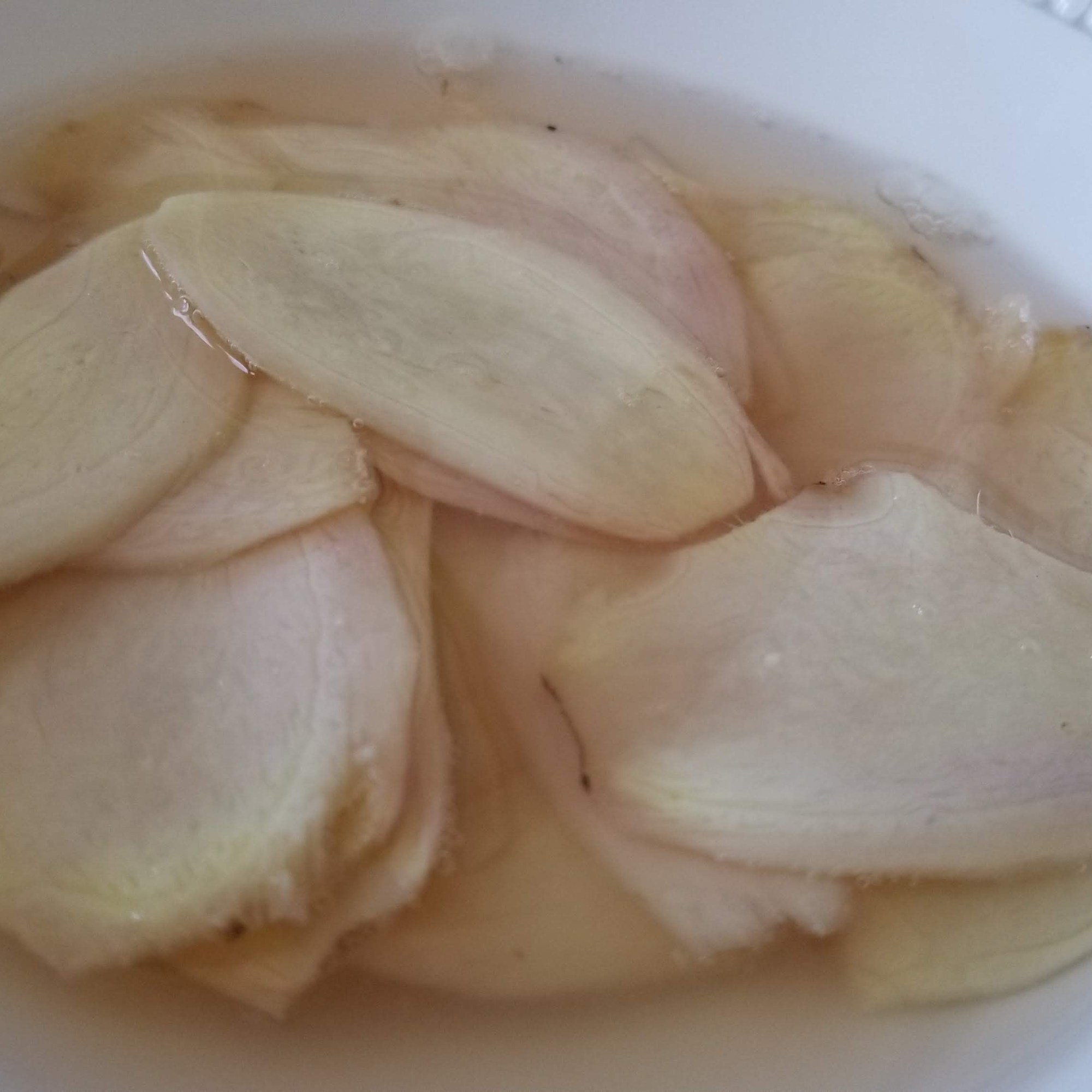 If desired, make some pickled ginger, which I personally love with my Sushi. Just peel and shave the ginger as thin as possible (a mandolin works great). Heat up some rice vinegar with a pinch of salt and sugar and then let cool to warm room temperature. Pour over the ginger and let stand for at least 2 hours, if not a whole day.